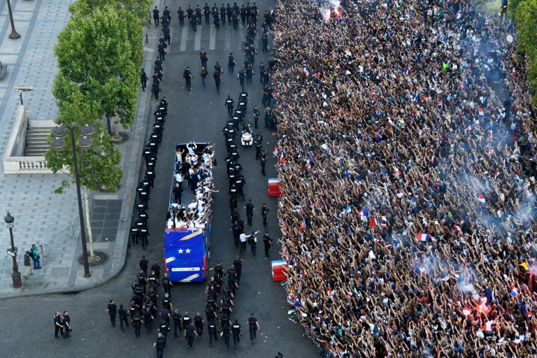 يحتفل منتخب فرنسا المتوج بكأس العالم لكرة القدم للمرة الثانية في تاريخه باحراز اللقب مع مئات الالاف من مشجعيه الاثنين بعد وصوله الى جادة الشانزيليزيه في باريس، على ان يستقبله الرئيس مانويل ماكرون في الاليزيه.