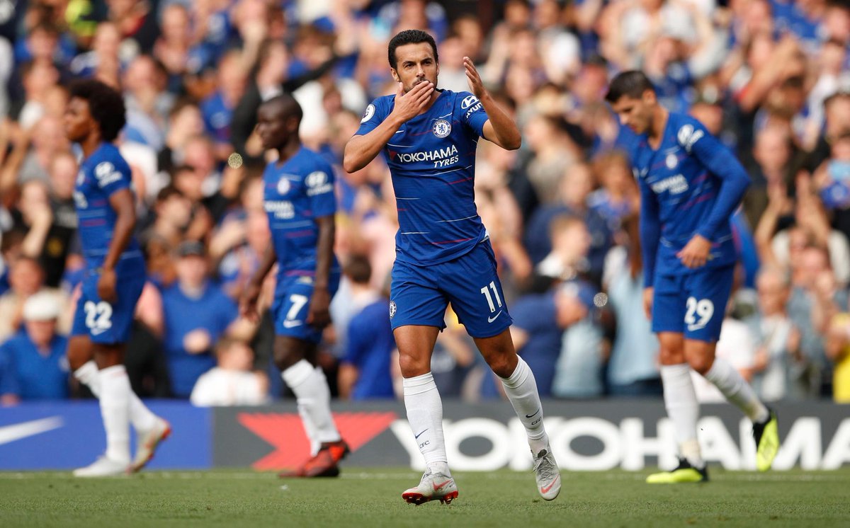 محاولات تشيلسي ظلت مستمرة حتى الدقيقة التاسعة التي شهدت تسجيل الهدف الأول عن طريق بيدرو، بعدما تلقى تمريرة أرضية من ألونسو، إنفرد على إثرها بتشيك ليضع الكرة في الشباك.