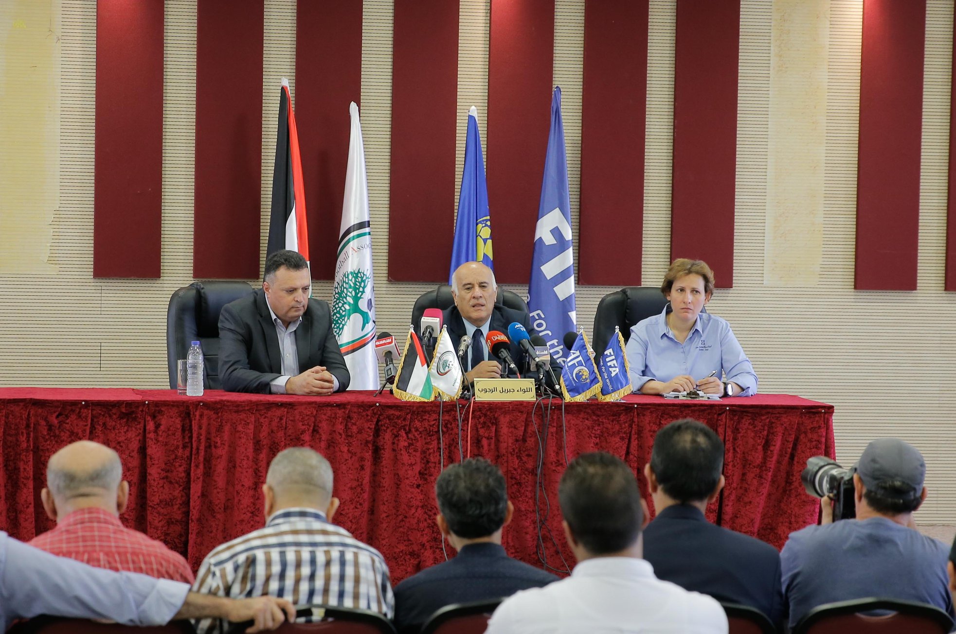 عقد اللواء جبريل الرجوب رئيس الاتحاد الفلسطيني لكرة القدم، اليوم الاثنين، الموافق 3.9.2018، مؤتمراً صحفياً في أكاديمية جوزيف بلاتر بالبيرة، بحضور حشد من وسائل الإعلام المحلية والعربية والدولية، تناول فيه تطورات الموقف الفلسطيني تجاه قرار لجنة الانضباط في الاتحاد الدولي لكرة القدم، وكيفية مواجهة هذا القرار في إطار الالتزام الفلسطيني بالقوانين والأنظمة الدولية وكيفية حماية الرياضة الفلسطينية من الاستهداف الإسرائيلي.