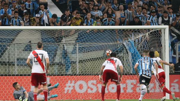 وسجل جونزالو مارتينيز ركلة الجزاء بعد توقف طويل وحصول بريسان لاعب جريميو على بطاقة حمراء.