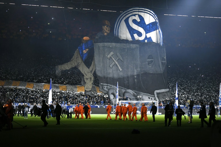 د ب أ/ا ف ب / إينا فاسبندرأحد عمال المناجم خلال مباراة شالكه وباير ليفركوزن ضمن الدوري الألماني لكرة القدم، في 19 كانون الأول/ديسمبر 2018.