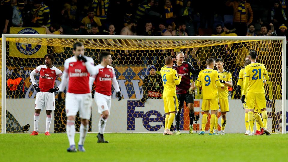 وسقط أرسنال في فخ الخسارة صفر 1 أمام مضيفه باتي بوريسوف من بيلاروسيا. وأحرز ستانيسلاف دراهون هدف بوريسوف الوحيد في الدقيقة 45، قبل أن تتضاعف معاناة الفريق اللندني، الذي اضطر للعب بعشرة لاعبين عقب طرد نجمه الفرنسي أليسكندر لاكازيت في الدقيقة 85.