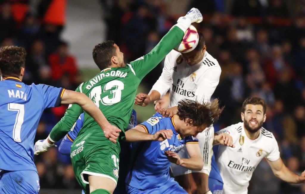 استهل ريال مدريد المباراة بفرصة لمهاجمه الفرنسي كريم بنزيمة صاحب اخر ثمانية اهداف لفريقه لكن تسديدته العكسية مرت الى جانب القائم بعد دقيقتين فقط. ثم تصدى حارس مرمى خيتافي دافيد سوريا لكرة اخرى لزيدان الذي يملك 21 هدفا هذا الموسم في الدوري المحلي ويحتل المركز الثاني في صدارة ترتيب الهدافين.