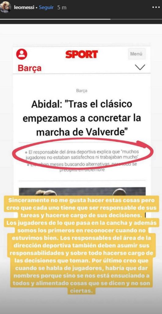 وشرح أبيدال، زميل ميسي السابق في الفريق، سبب إقالة فالفيردي رغم تصدر الفريق للدوري وذلك في مقابلة مع صحيفة دياريو سبورت الإسبانية. وقال أبيدال “لم يكن الكثير من اللاعبين يشعرون بالرضا أو يقدمون أفضل ما لديهم كما كانت هناك مشكلة في التواصل. العلاقة بين المدرب واللاعبين كانت طيبة إجمالا لكن بصفتي أحد اللاعبين السابقين في الفريق كنت أشعر بوجود شيء ما. أبلغت مسؤولي النادي بما أشعر به وتوصلنا إلى قرار (بشأن فالفيردي)” ورد ميسي على أبيدال عبر انستغرام بوضع دائرة حول تصريحات المدير الرياضي لبرشلونة.