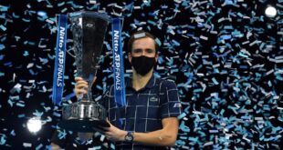AFP توّج الروسي دانييل مدفيديف المصنف رابعا بلقب بطولة الماسترز الختامية التي تجمع سنويا بين أفضل ثمانية لاعبين خلال الموسم، للمرة الأولى في مسيرته بفوزه في المباراة النهائية على النمسوي دومينيك تييم الثالث 4-6 و7-6 (7-2) و6-4 في لندن التي تحتضن الحدث للمرة الأخيرة قبل انتقاله الى تورينو. وتوج الروسي ...