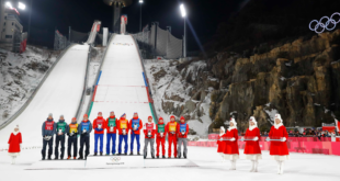 BeIN SPORTS أحرزت النرويج ذهبية القفز من منصة كبيرة للفرق (رجال) في مسابقة القفز على الثلج، اليوم الاثنين، في دورة الألعاب الأولمبية الشتوية “بيونغ تشانغ 2018”. وحلت النرويج في المركز الأول برصيد 1098.5 نقاط، متفوقة على ألمانيا الثانية وصاحبة الميدالية الفضية بـ 1075.7 نقاط، فيما نالت بولندا الميدالية البرونزية بحلولها ...