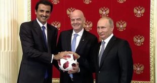 رويترز سلم الرئيس الروسي فلاديمير بوتين يوم الأحد راية استضافة كأس العالم لكرة القدم إلى أمير قطر الذي ستستضيف بلاده نسخة 2022 من البطولة. وفي احتفال أقيم في الكرملين، سلم بوتين كرة كأس العالم الرسمية إلى جياني إنفانتينو رئيس الاتحاد الدولي (الفيفا) الذي سلمها بعد ذلك إلى الشيخ تميم بن ...